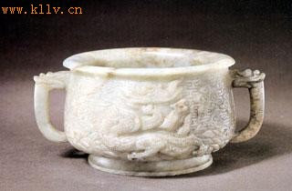 青玉云龙纹炉为故宫玉器的代表作品。宋代出品,高7.9cm,口径12.8cm.炉青玉质。通体以“工”字纹为底,上饰游龙、祥云和海水纹。器内底阴刻乾隆七言诗一首:“何年庙器赞天经,刻作飞龙殿四灵。毛伯邢侯异周制,祖丁父癸似商形。依然韫匵阅桑海,所惜从薪遇丙叮土气羊脂胥变幻,只余云水淡拖青。”末署“乾隆戊戌孟秋御题”。