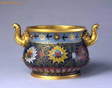 掐丝珐琅缠枝莲纹象耳炉,元,通高13.9cm,口径16cm,足径13.5cm。清宫旧藏。 炉铜胎,圆形,鼓腹,象首卷鼻耳,圈足。炉颈部浅蓝釉地,饰黄、白、红、紫四色菊花12朵。腹部宝蓝釉地,饰红、白、黄三色掐丝珐琅缠枝莲花6朵。其下饰莲瓣纹一周。此器釉质莹润,有的部分釉质呈玻璃般的透明状,珐琅色泽浑厚谐调,富丽典雅,是一件高水平的元代掐丝珐琅作品。