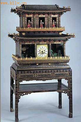 彩漆描金楼阁式自开门群仙祝寿御制钟为故宫钟表的代表作。高185cm,面宽102cm,侧宽70cm.此钟共有7套机械系统,分别控制走时、报时、景箱内的活动装置等,技术水准相当高。根据记录,从乾隆八年接旨着手设计到十四年完工,历时五年多。17世纪前,中国皇宫一直以铜壶滴漏计时。意大利传教士利玛窦带着两个西洋自鸣钟叩开了中国宫廷的大门。