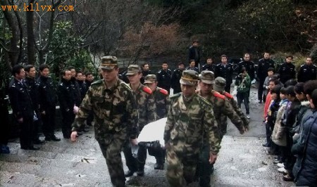 2010年12月13日凌晨2点37分,在安徽黄山景区因迷路被困的18名上海驴友在黄山景区一个未开发开放区域被当地搜救人员找到,不幸的是,50分钟后,23岁的黄山风景区公安局民警张宁海在护送途中不幸坠崖身亡。图为武警官兵护送张宁海的遗体。