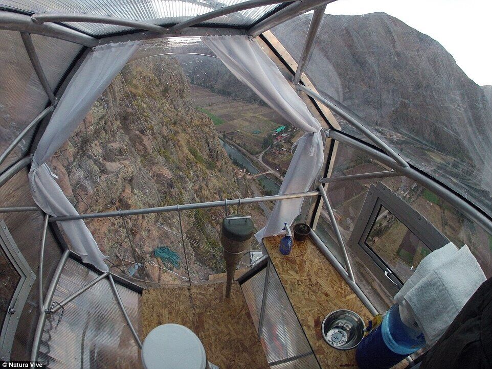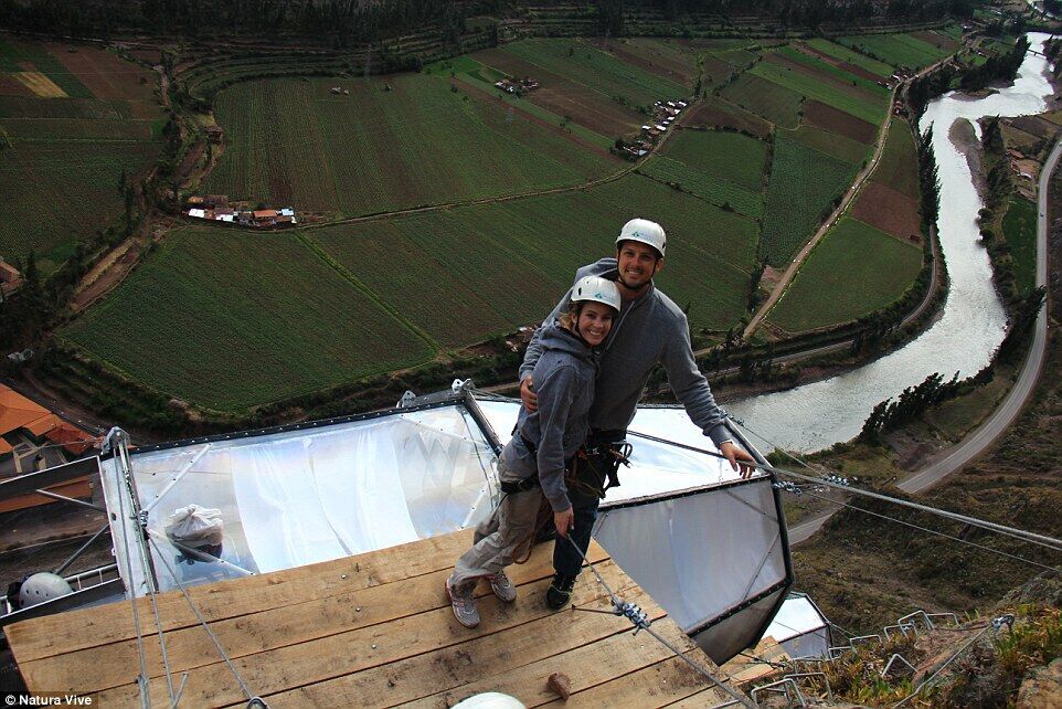 时间:2015-07-08 22:41:19 来源:不详 图集详情 据英国《每日邮报》6月30日报道,秘鲁的神圣山谷风景壮丽秀美,如果你够胆大,现在入住山谷悬崖峭壁上的3个透明茧型卧舱,体验400英尺(约为121米)高空的刺激夜晚。 这3个高空透明茧型卧舱名叫“Natura Vive Skylodge”,堪称货真价实的空中酒店,可容纳最多8人入住,且包含早餐和附带红酒的丰盛晚餐。“Skylodge”建造材料采用太空铝和可应对各种天气聚碳酸酯,安全可靠。每个卧舱长24英尺宽8英尺(约为长7米宽2.4米),包含4张床,一个用餐区和一个封闭卫生间,且有6扇窗户便于通风,舒适性不输平常酒店。 但想到到达位于山谷最高峰侧面的“Skylodge”并非易事,旅客首先要经历铁索攀岩的考验,或者体验一把高空滑索。入住后,旅客便可躺在透明的卧舱中,300度纵览山谷美景。