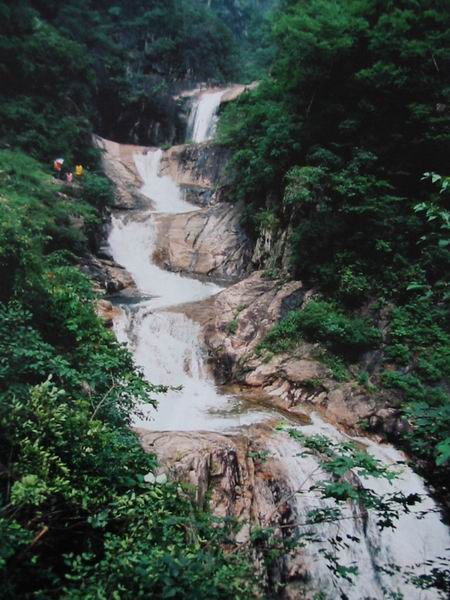 (40)地鼓岩:山路曲折中,游人脚下出现地鼓岩,用脚跺击,咚咚作响。 (41)好汉坡;继续前行,至好汉坡。好汉坡虽不陡峭,却很长,是考验人们意志和耐力的地方,能一口气登上去的方称为好汉。 (42)三仙洞:继续下行,至三仙洞。三仙洞为明代建于山坳中的一体三道拱形石门,每道石门各为一个庙房,分别敬奉福、禄寿三仙。石拱内有小门互通,旧时洞内有雕像、碑碣及石刻,今仍有遗存。石拱上部原有天爷庙,今仅存石基。站在三仙洞,福星、禄星、寿星三峰环列,环境开阔而又谧静,仿佛使人置之身于古堡探奇的幽境之中。 2、百尺潭瀑布景区 (1)漩水潭瀑布 (2)牛魔潭瀑布:位于冷水河上。