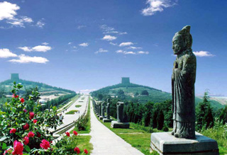 ; 从乾陵头道门踏上石阶路,计537级台阶,其台阶高差为81.68米。走完台阶即是一条平宽的道路直到“唐高宗陵墓”碑,这条道路便是“司马道”。两旁现有华表1对,翼马、驼鸟各1对,石马5对,翁仲10对,石碑2道。东为无字碑,西为述圣记碑。有王宾像61尊,石狮1对,周围还有17座陪葬墓。“唐高宗陵墓”墓碑,高2米,是陕西巡府毕源为高宗所立,原碑已毁,现在这块碑是清乾隆年间重建的。此碑右前侧另一块墓碑,是郭沫若题写的“唐高宗李治与则天皇帝之墓”12个大字。