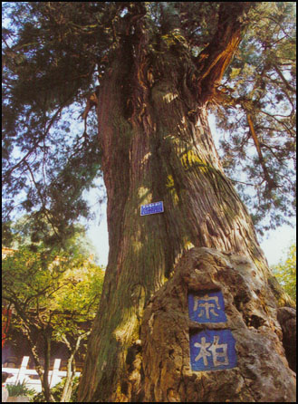 清香袭人。阮元曾写过两首赞唐梅的诗: 千岁梅花千尺潭,春风先到彩云南。 香吹蒙凤龟兹笛,影伴天龙石佛龛。 玉斧曾遭图外划,骊珠常向水中探。 只嗟李杜无题句,不与逋仙季迪谈。 铁石心肠宋开府,玉冰魂魄古梅花。 边功自坏鲜于手,仙树遂归南诏家。 今日太平多雨露,当年万里隔烟霞。 老龙如见三沧海,试与香林较岁华。 这两首诗镌刻在本观碑馆之中的石碑上。作者以唐梅历经的岁月沧桑,回顾云南历史,充满了对祖国边疆神奇土地的热爱之情。 现在,黑龙潭公园在后山上广植梅树,有红、白、绿梅等近90个品种6000余株,构成一道新的风景,命名为“龙泉探梅”,是昆明新的十六景之一。黑龙潭梅园占地427亩,是目前中国最大的梅园之一。 唐梅近旁便是宋柏,高28米,直插云表,枝叶茂密,古根盘结,是观中现存最雄伟挺拔的古木,距今已有八九百年的历史了。袁嘉谷曾赋《宋柏行》诗云:“风霜饱阅八百载,柏身老矣色不改。问柏何缘老不改,中坚持有性根在。”此诗既赞美宋柏饱经风霜仍生机盎然,又表达了作者高远的志向,抒情哲理融为一体,具有深刻的涵意。 明代种植的茶花树亦在院内。冬末初春,其它茶花尚含苞待放,它已花红似火,艳如桃花。品种名为早桃红。“云南山茶甲天下”。确实,滇中花木,山茶首屈一指,位列云南八大名花之首,又是昆明市的市花。明代诗人担当曾写这样一首赞美山茶的诗:“冷艳争春喜烂然,