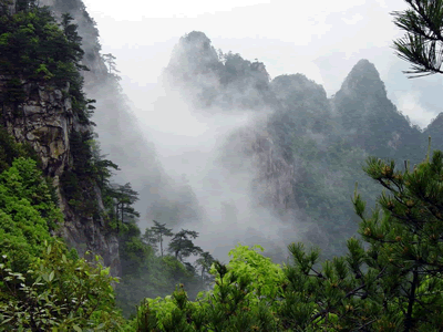 雾山云海是大明山经常可见的景色,特别是春秋二季,时而滚滚云海翻腾飞跃,将青山吞没;时而座座青峰又隐现于虚无缥缈的云山之中。夏季的早晨,特别是霁雨初晴,青山滴翠,冉冉升起的红日映照着白絮般的云海,丛丛峰林浮露于滚滚的云海之上,就象散布在大海中的瀛洲仙岛。 大明山的云海足以称奇,但那里的飞瀑群更是令人叫绝。飞瀑主要分布于玉龙溪和白蛇涧,在大明村汇合。玉龙溪水量充沛,水流湍急,于峭壁丛生的峡谷险境中奔腾北流,不仅山明水秀,绿荫葱葱,而且处处可闻响如壑雷的水涛声。玉龙潭的上游自千亩田北龙门口以下,垂直河床骤然增大,一公里流程落差竟达四百多米,溪水劈开万仞石山,飞流直下,形成四级瀑布,以龙门瀑布最为壮观。 白蛇涧自外兰塘缓缓流去,一进入花岗岩区,水流骤然湍急,形成五级瀑布,自上而下依次为剑池瀑、玉笏瀑、白蛇瀑、三龙戏珠瀑,瀑间有潭,潭中有鱼,长尺许,见人不惊。 ![]()