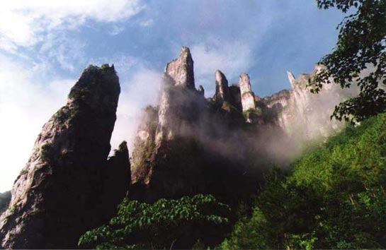 如银柱,高18米,从U字形缺口倾落,注入潭中,碧绿的水面卷起堆堆白雪,隆隆瀑声如闷雷,如击鼓。五星潭:当地人称“五龙潭”。名为“五星”,实则是一组首尾相衔,奇绝妙绝的三瀑三潭。下潭,也叫榬丝潭,略呈三角形,广约200平方米,绿似翡翠,深不见底。潭四围山岩耸立如壁,潭似巨型石水缸,潭布落差15米,分成数股沿石壁斜泻潭中。中潭,近似圆形,广超半亩,水深7米,瀑高约10米,贴60度石壁转折入潭。潭中瀑影闪现,犹白龙遨游碧空。潭口岩石被冲出一条长10米、宽0.4米、深0.3米的沟槽,潭水在石槽中汩汩而流。人坐槽沿,任清泉轻抚足踝,惬意非常。上潭,广约100平方米,呈斜三角形,碧绿不见底,瀑高2米余,从峭崖间奔腾而出,直入潭中。潭周皆石,而天地略显宽阔。连缸潭:位于五星奇潭上游近一公里处。在不到100米的溪谷中,6瀑6潭似珠串连,潭形状各异,均以全石为底,潭壁平整光滑,好象人工做出的一排连缸。其中二潭广约30平方米,潭壁陡峭,潭水凝碧,瀑高约6米,一半贴壁,一半悬空,悬空瀑后面,石壁往里凹进,深约3米,整个瀑壁犹如张开的蚌壳,银瀑似白衣公主脱壳而舞。 芙蓉三冠 芙蓉三冠也即芙蓉三崖,地处芙蓉古村西面的山上,三崖皆峭拨高耸,凌空矗立,其石色皆白里透红,倒映山下清清溪水中,宛若三朵含苞待放的芙蓉花,芙蓉崖故此得名。 该景点还有:紫云洞、崇固洞、南崖寨等景致。