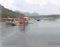 鱼鹰捕鱼表演是天目溪漂流一项特色旅游项目。看,鱼鹰潜入水中了,一会儿叼起一条白晃晃的鱼儿,大半条露在嘴外。只见鱼鹰的主人用竹篙一伸,把鱼鹰挑到了竹筏上,用手在鱼鹰的脖子上只轻轻一捏,鱼就进了鱼篓里。据说,鱼鹰捕鱼的时候很齐心协力,当一只鱼鹰抓到一条大鱼