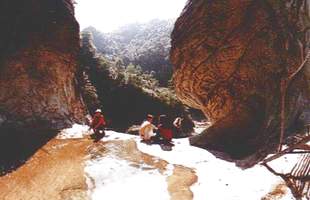 锁龙谷 在百丈涂电厂右上方约1 西天屏 在锁龙谷左上方,一爿绝壁如刀削般从锁龙谷右侧的溪旁耸立。高200余米,宽150余米,如屏如峰,撑起一片苍穹;雄鹰盘旋,气势磅礴,雄伟壮观。石壁多为赤色。岩缝间苍松与杜鹃花争奇斗艳,色彩斑斓。西天屏顶,天漏一角,溪流从天而降,分二折直泻而下,跌入瀑下的白龙峡中,高达百米。白龙峡,象一条石棺,长100多米,深2米,宽2米,槽内水流湍急,如白龙冲峡而出。