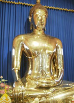 ![]() 金佛被发现的年代大约在七百多年前,据说佛寺所在地本来颇为荒凉,后来华人逐渐聚居。他们把扔在荒山上的一个无人肯要的佛像雇车搬了回来,搬运时,佛像可拆卸成9节。几经周折,运抵寺庙后,佛身有一块铁壳掉下,露出里面金光闪闪的金佛像身。把所有铁壳敲掉后,金光闪亮的完整佛身露了出来,因此名闻全国,后定名该寺为金佛寺。 另有一传说,称这尊
